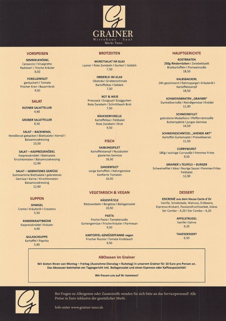 Welcome to Das Grainer, nestled in the heart of Tann, Germany at Marktpl. 4. This charming eatery exudes a warm, rustic ambiance that invites you to indulge in a truly Bavarian culinary experience.